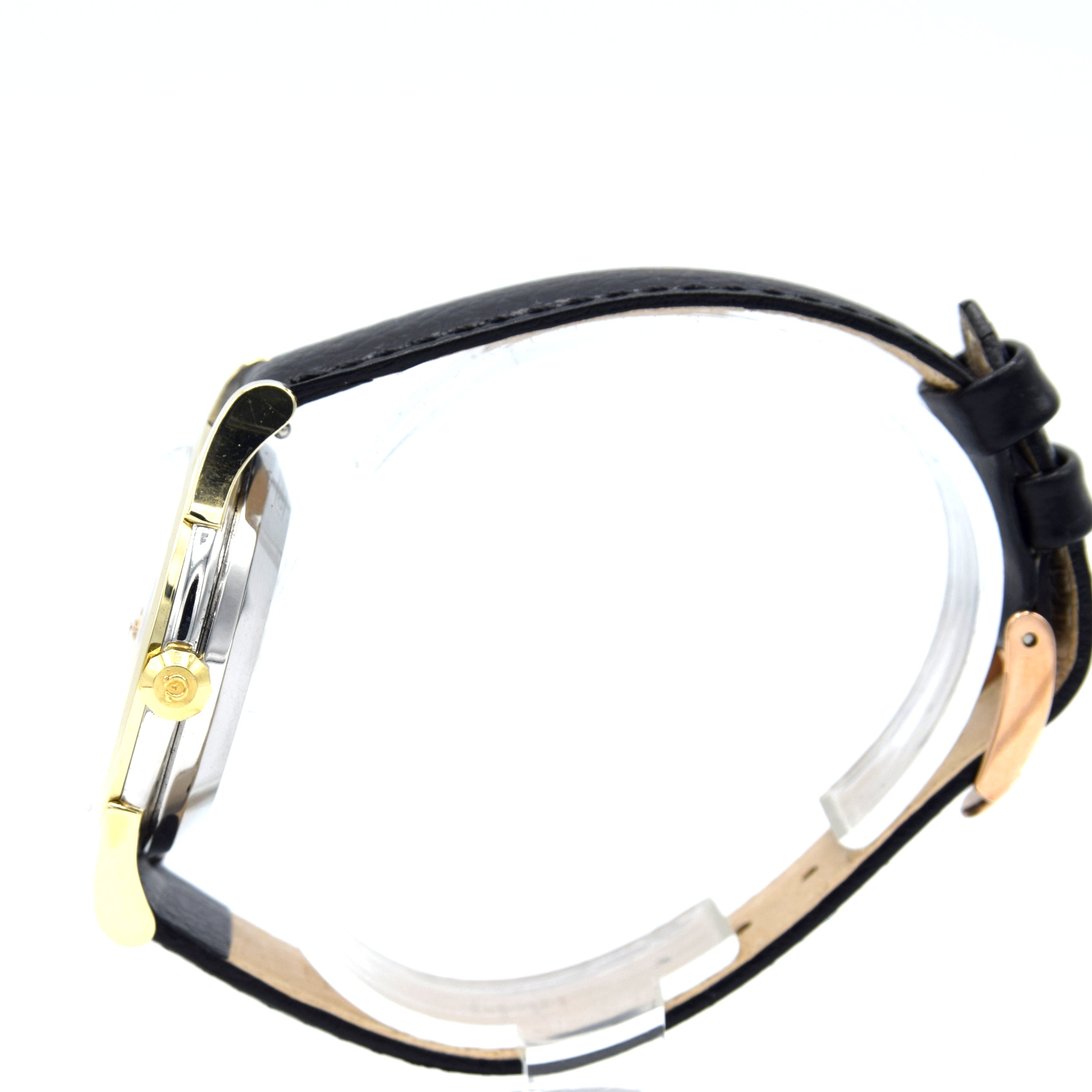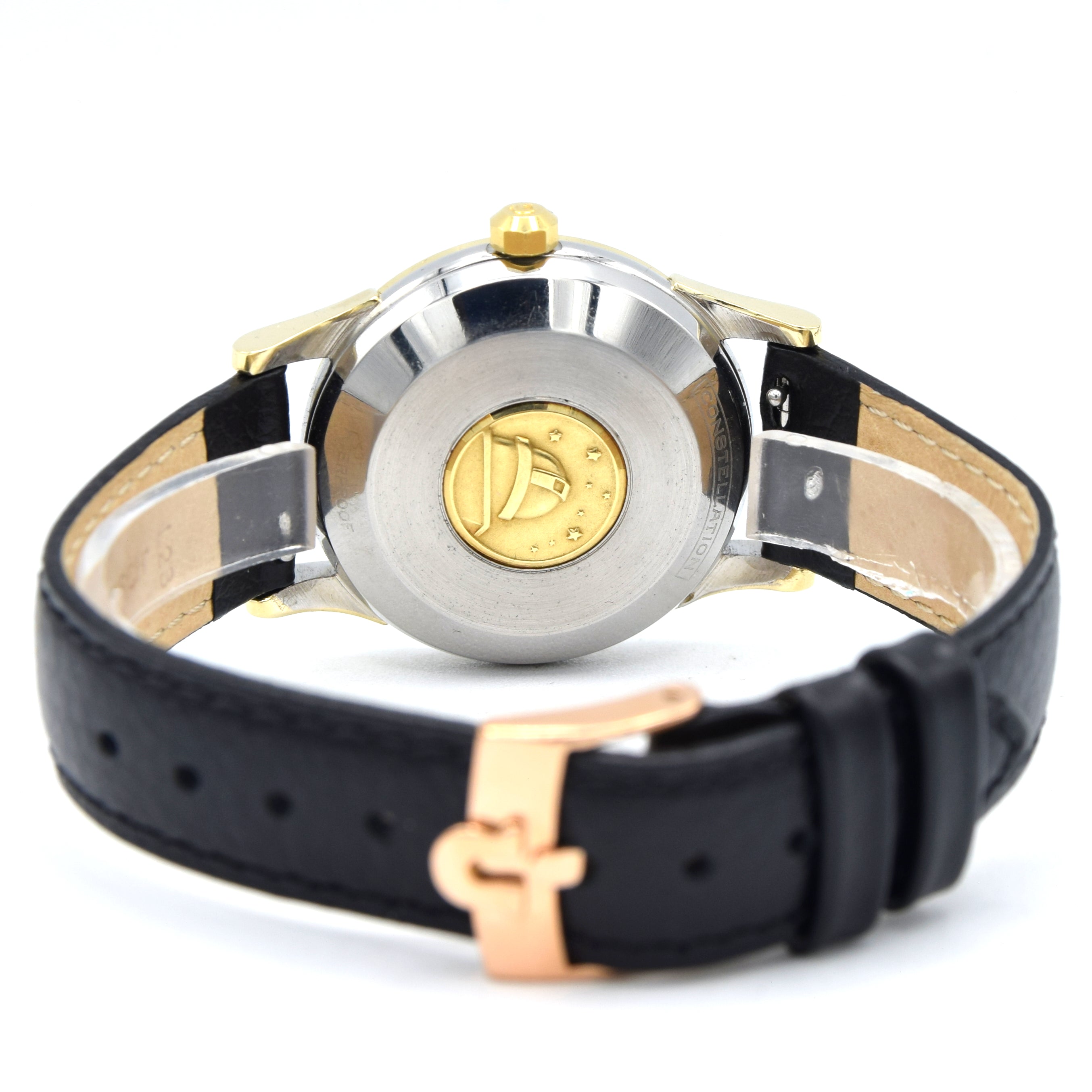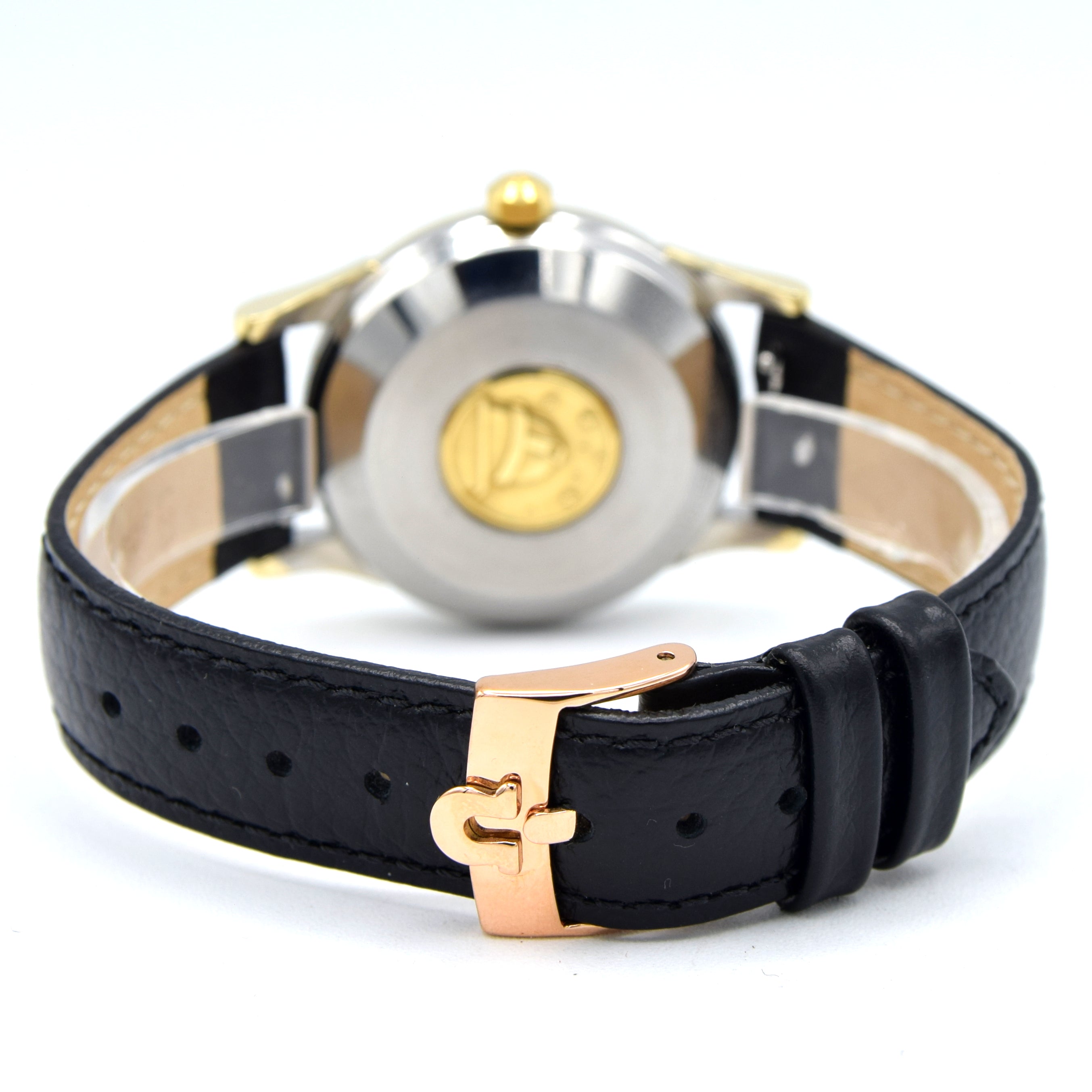 The 35mm, stainless steel & Gold clip-back case is a comfortable wear and the case back has the Geneva Observatory surrounded by eight stars - the official motif of the Constellation. Inside is the automatic, chronometer tested and officially certified, Omega caliber 504, fully serviced by us and running strongly. We've paired the watch on a simple black calf grain leather strap which in our opinion blends plain works.