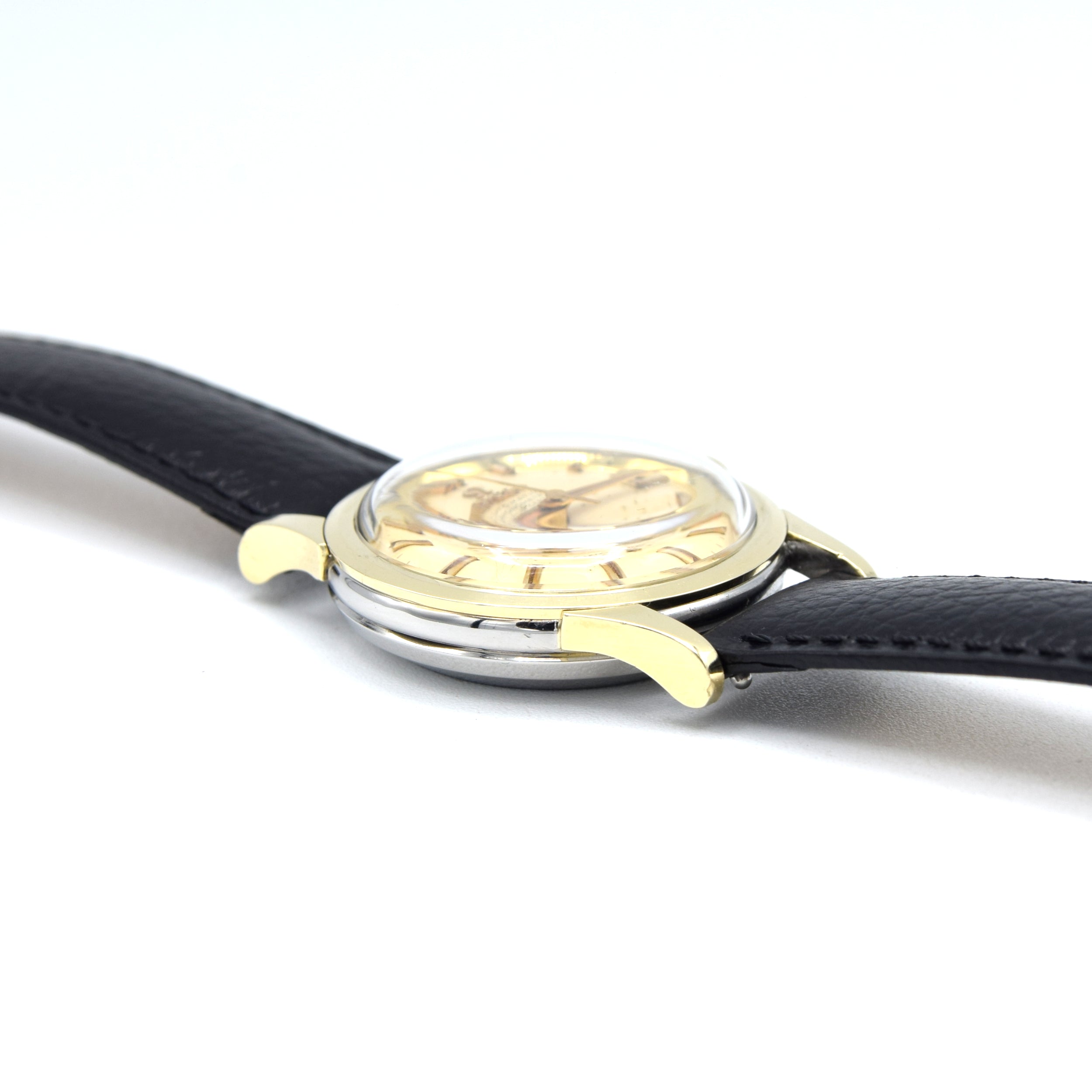 This watch pairs a stainless steel case with gold accents, giving it that perfect mid-century two-tone warmth without being overly flashy. At 35mm it wears wonderfully on modern wrists — especially with the long, clean lugs typical of the period — and the simple, smooth bezel keeps the focus exactly where it should be: the dial.
