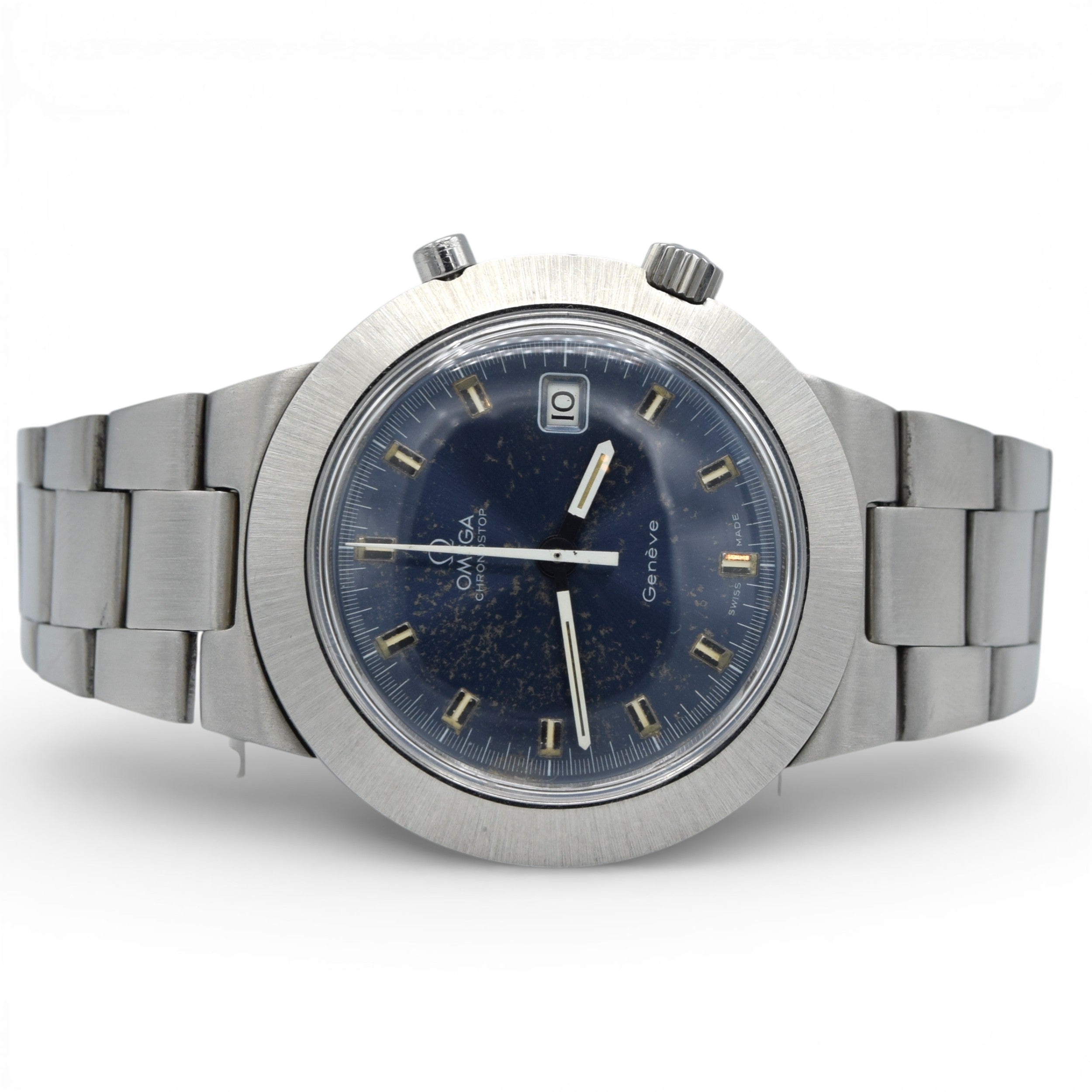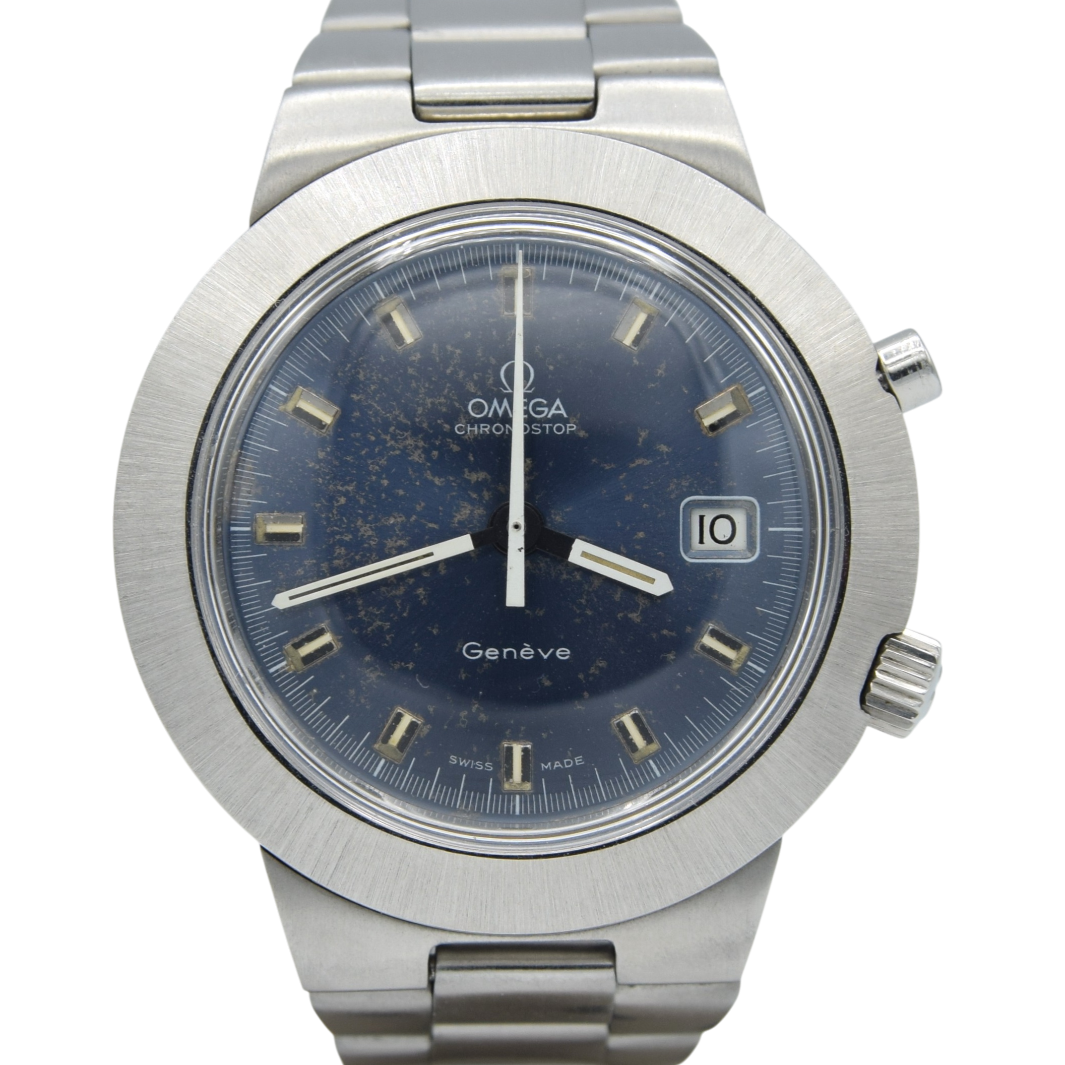 1969 Omega Rare Jumbo ufo "Chronostop Fontana Pentatlon" Geneve with satin blue Dial Model 146.012 on Bracelet
