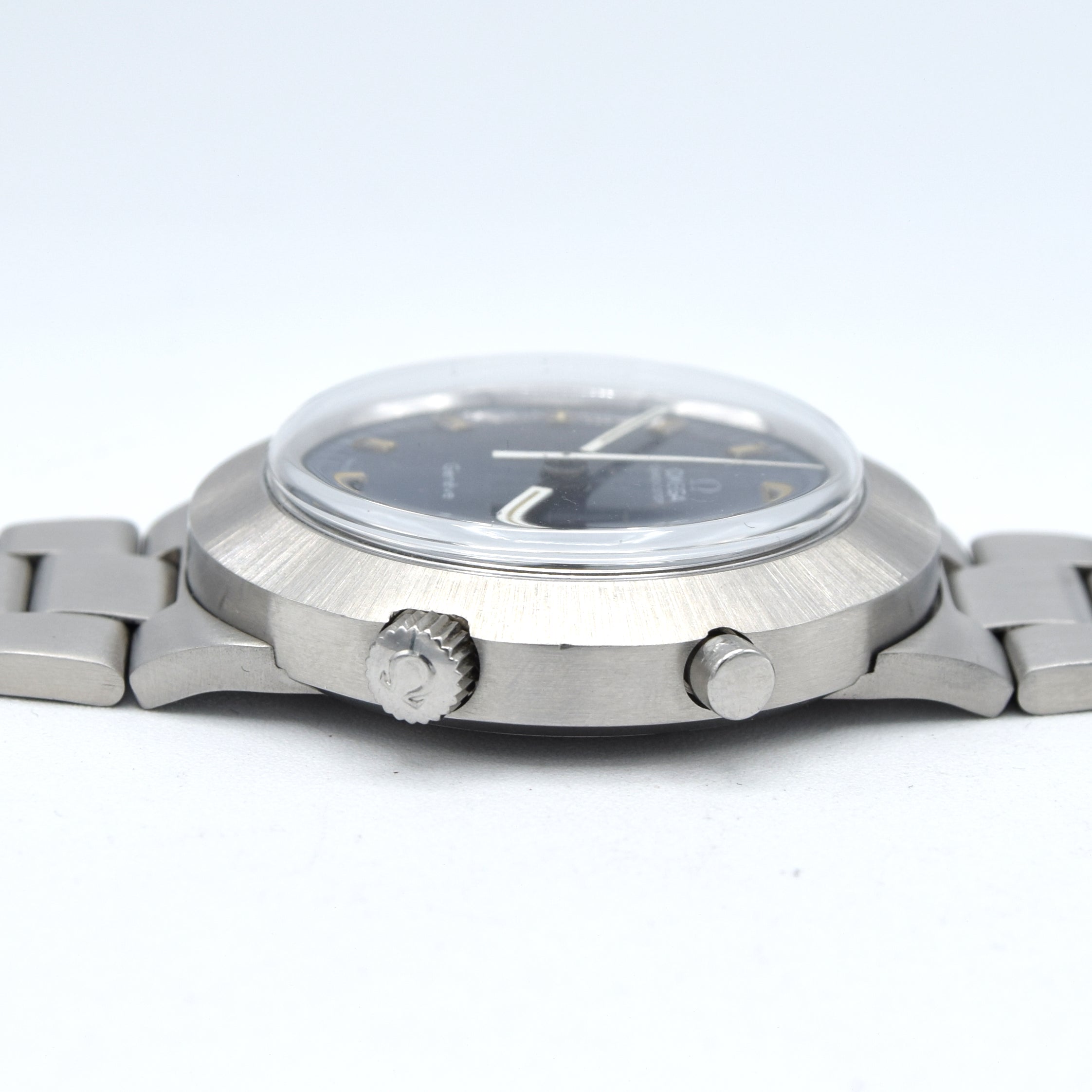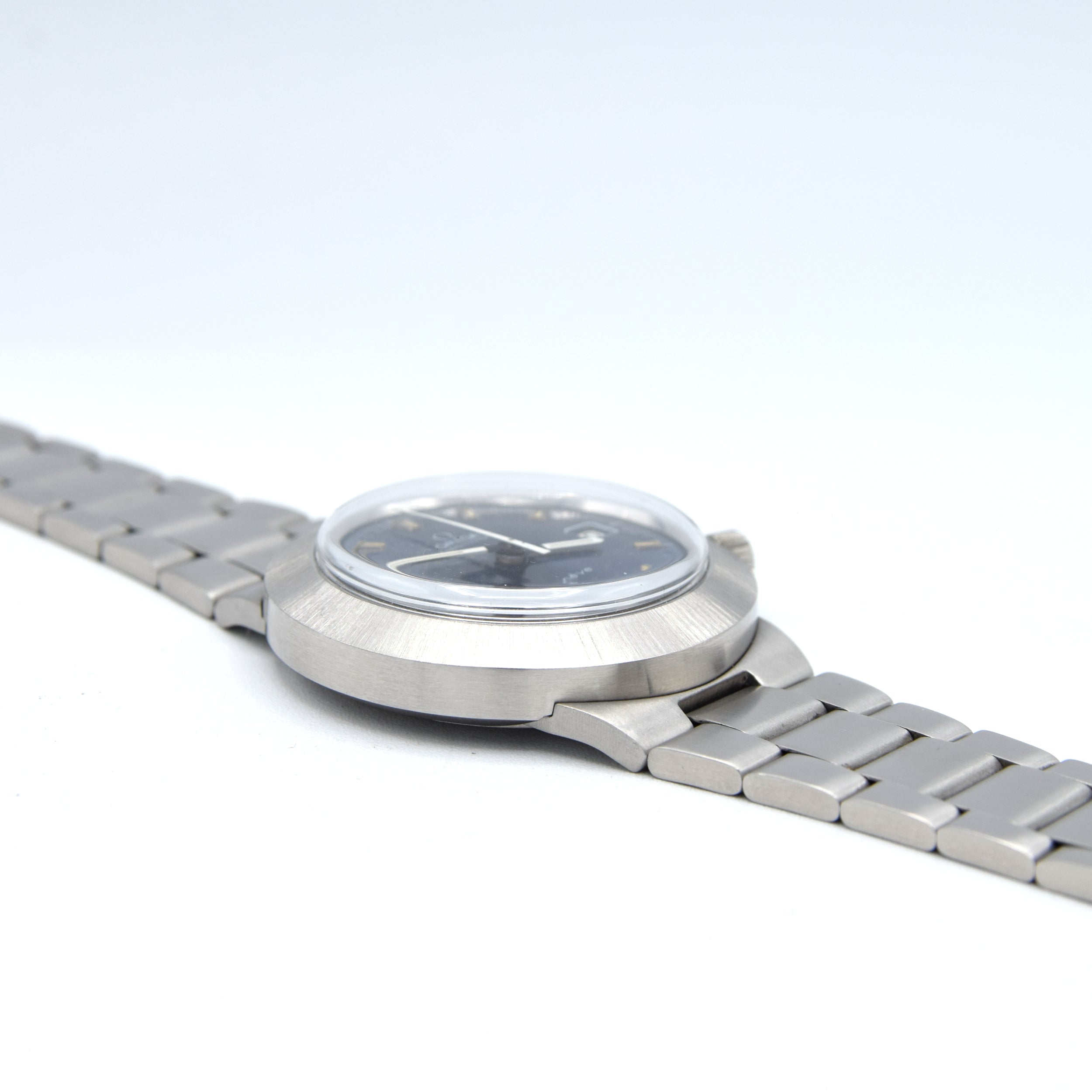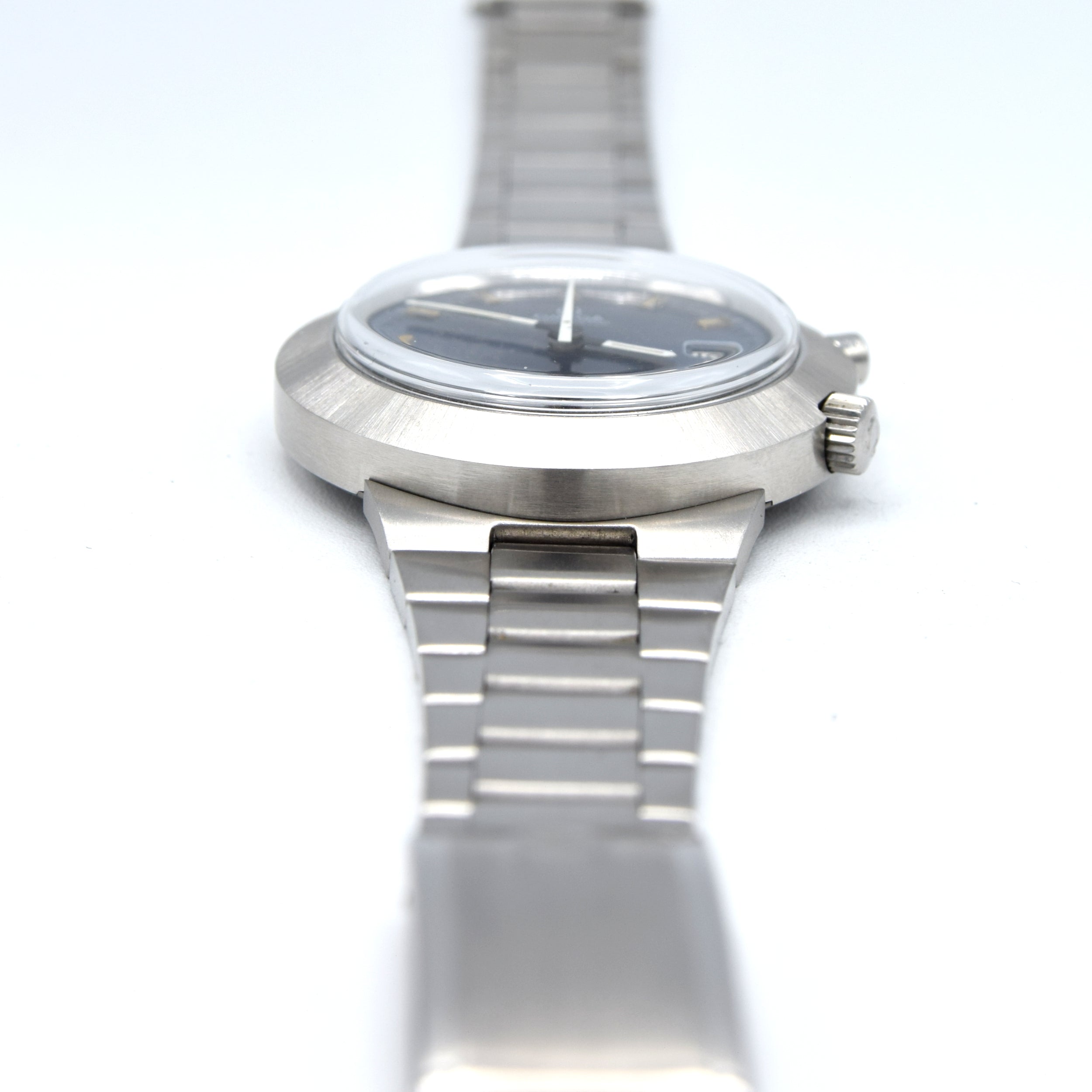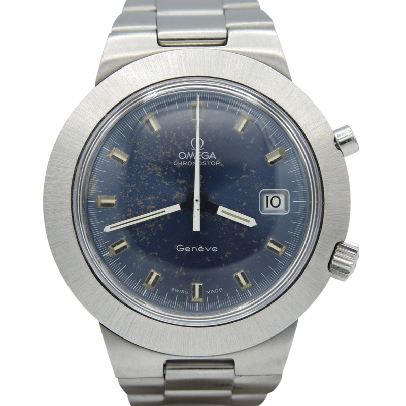We have here an Omega Chronostop with a difference! Not the standard everyday version we see but a Jumbo 42mm stunning, UFO style satin sunburst blue dial which changes colour in different lights. As with most of these 1960s- 1970s metalic colour dials it shows some patina, however its even and in our opinion just adds character. The watch Also has a date window at 3 o'clock and outer minute tracking. Applied chamfered edges baton indexes mark the hours and sword White / Black hands with luminescence infill complemented by a tapered white centre chrono hand.