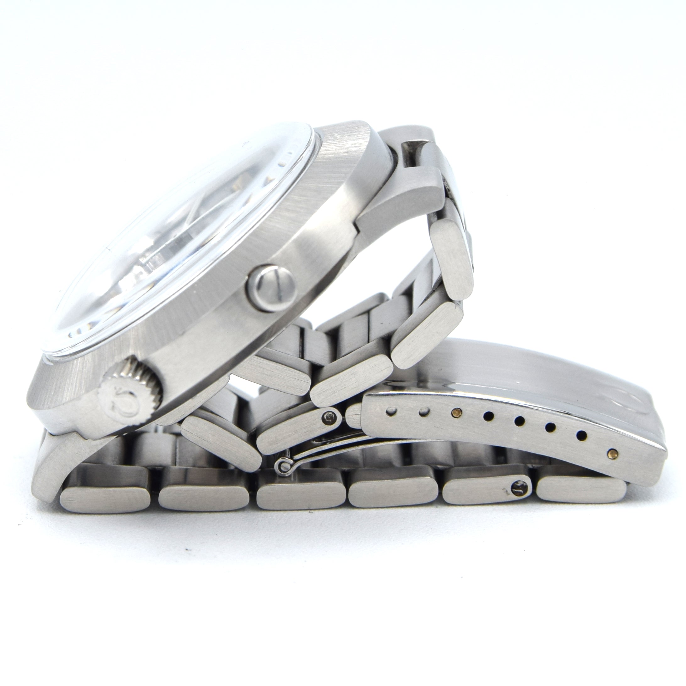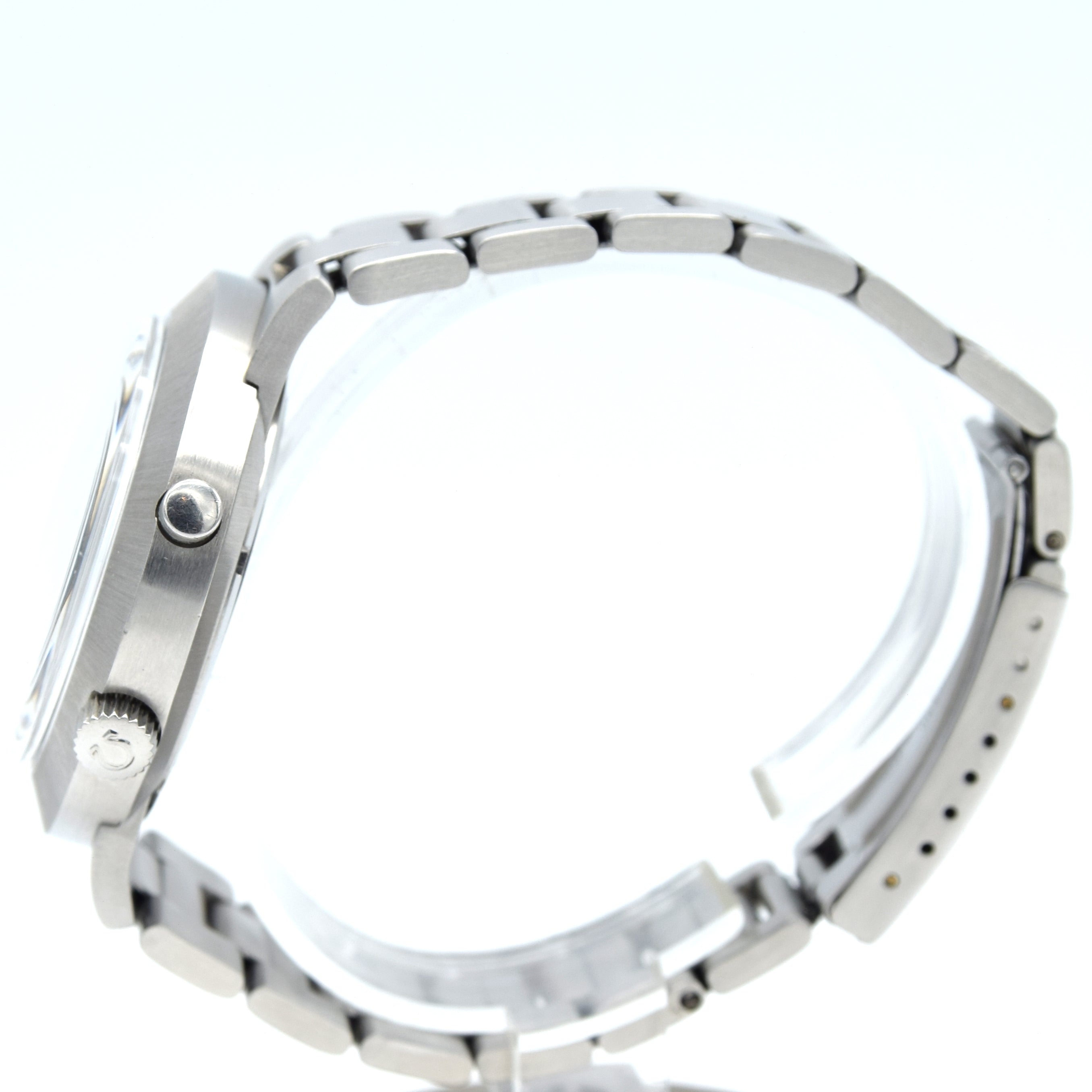 On the reverse, a screw back that holds only the bracelet in place. Inside is the mechanical manual wind Omega Cal. 920, 17 jewels, fully serviced by us and running strongly. The watch comes fitted on its original, integrated, stainless steel, Omega bracelet.