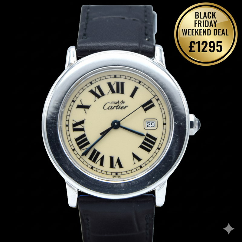 We have here a neo-vintage, Cartier Ronde 1800 from the 1990s. Complete with an original cream dial, as well as the classic Cartier features of Roman numerals, railway-style minute tracking and blue steel hands but with a sapphire winding crown for that extra touch of elegance! The dial also has the date feature at 3 o'clock .